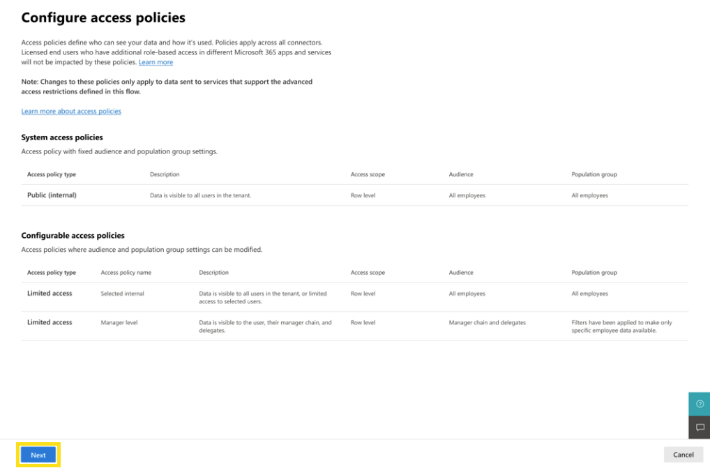 Any modifications you make to the access policies are reflected in the table on the Configure access policies page. To continue, select Next.