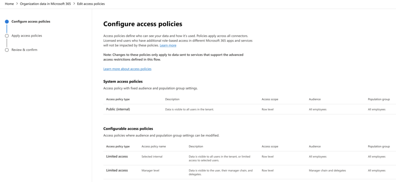 Access policies define who can access which organizational data attributes, for whom, and at what level of detail. These policies are created and managed centrally in Organizational Data in Microsoft 365 by a Microsoft 365 Global Administrator or the Organizational Data Source Administrator. Access policies ensure that, where appropriate, a consistent set of usage rules can be shared alongside the organizational data to the apps that are using that data.