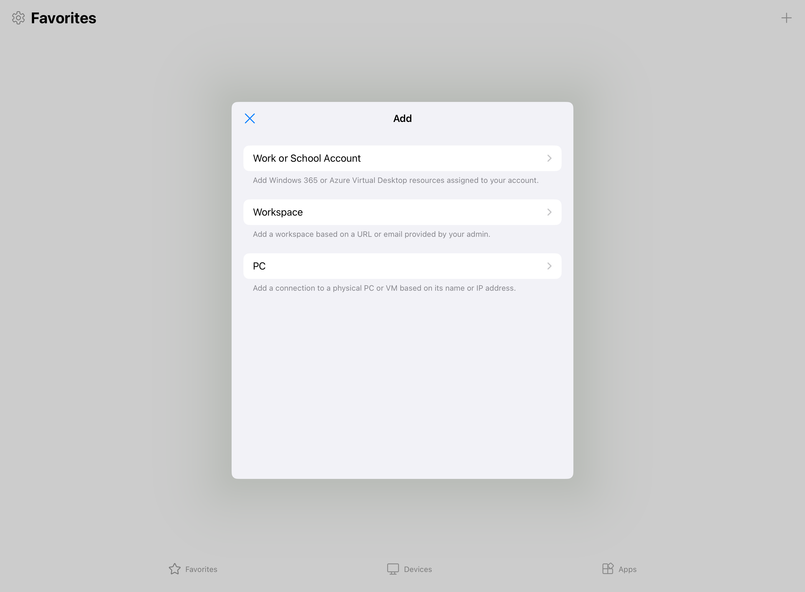 Windows App zostanie otwarta na karcie Devices. Wybierz plus (+), a następnie wybierz Dodaj obszar roboczy.
