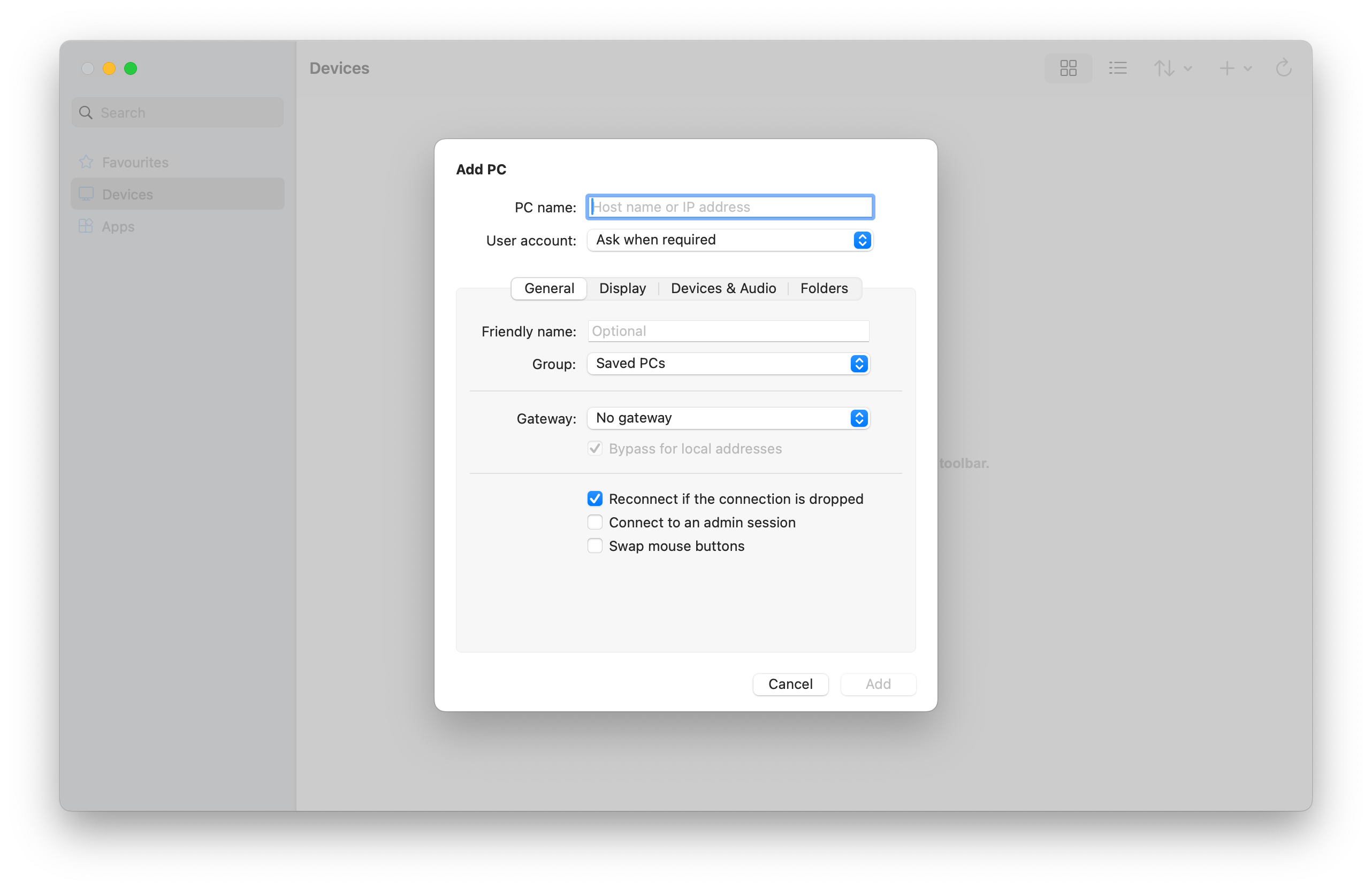 Wybierz pozycję Dodaj, aby dodać komputer zdalny do karty Urządzenia. LUB wybierz pozycję Dodaj i połącz, aby dodać komputer zdalny do karty Urządzenia i natychmiast uruchomić połączenie.