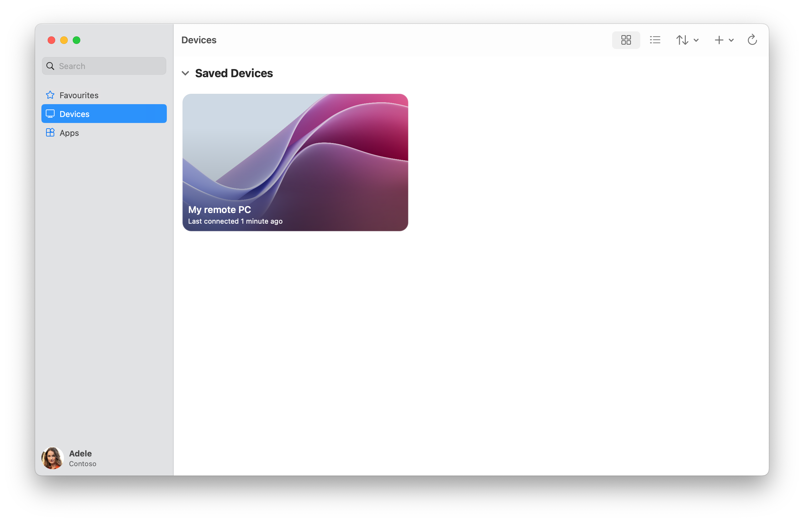 Windows App otwiera się na karcie Devices. Wybierz ikonę plus (+) w lewym obszarze nawigacji lub Wybierz zasób, aby dodać.