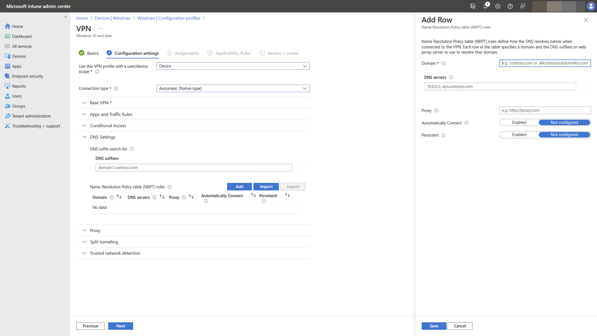 The following image shows name resolution options in a VPN Profile configuration policy using Microsoft Intune.