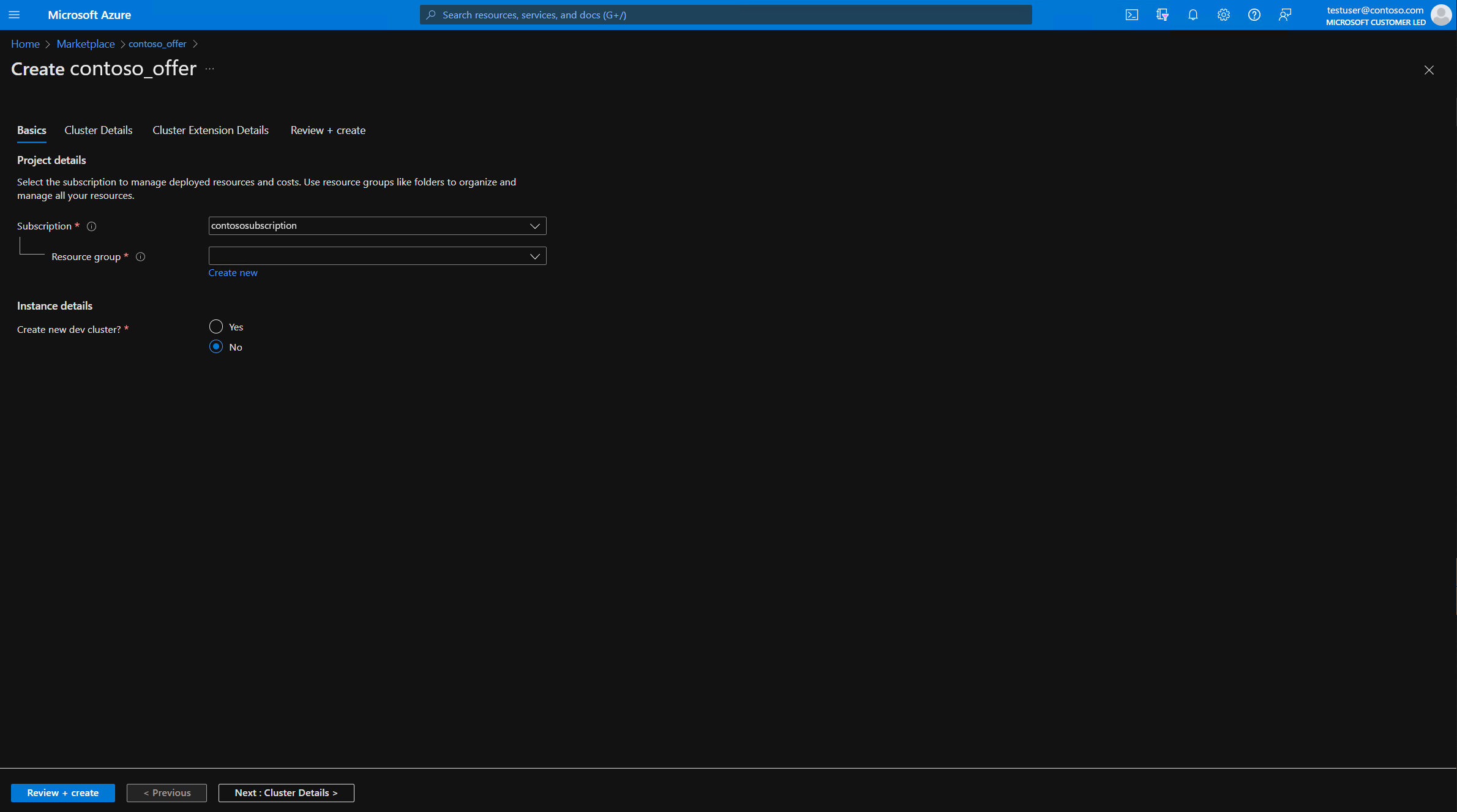 Siga cada página no assistente, por meio de Examinar + Criar. Preencha as informações do grupo de recursos, do cluster e de todas as opções de configuração necessárias para o aplicativo.
