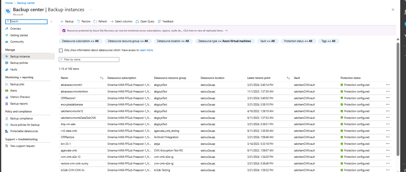 O painel itens protegidos mostra todas as instâncias de backup criadas entre as assinaturas. Use os filtros para acessar a instância de backup que você gostaria de dar uma olhada. Selecione o item protegido e abra-o.
