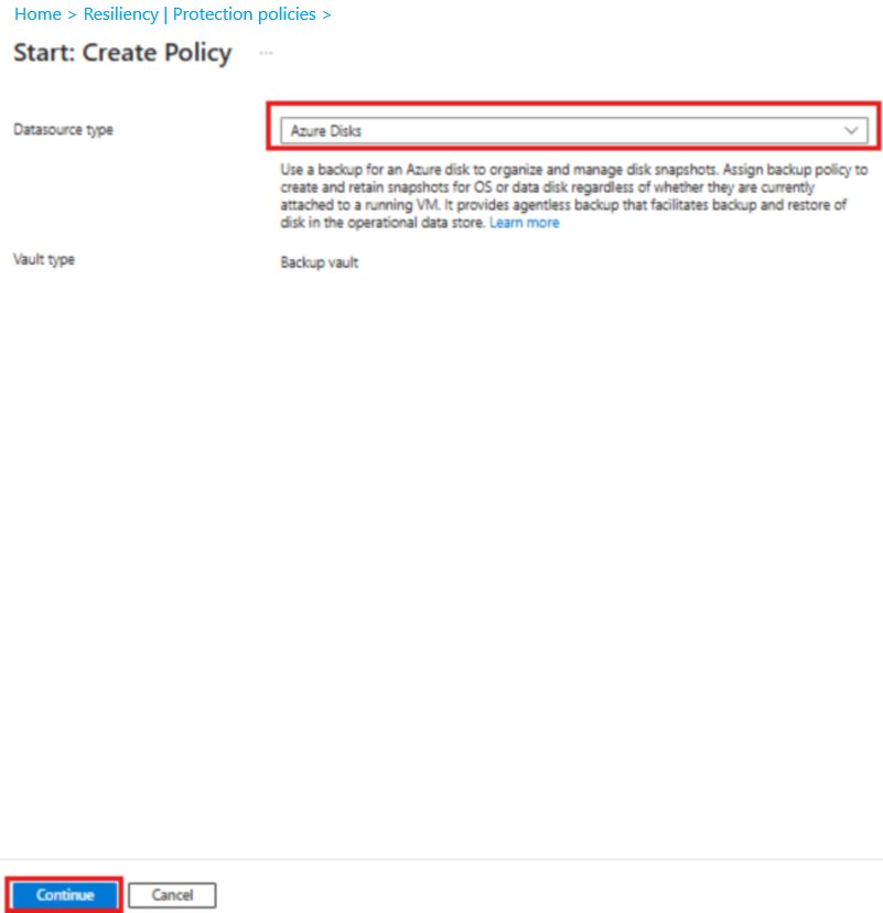 No painel Iniciar: criar política, selecione o Tipo de fonte de dados como Discos do Azure e selecione Continuar.