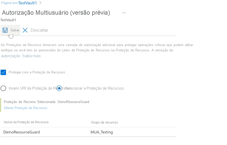 Você pode especificar o URI do Resource Guard. Especifique o URI de um Resource Guard ao qual você tem acesso de Leitor e ele está na mesma região que o cofre. Encontre o URI (ID) do Resource Guard na página Visão geral.