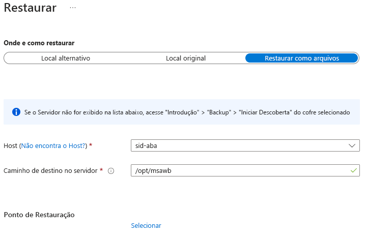 No painel Restaurar , em Onde e como restaurar, selecione Restaurar como arquivos.