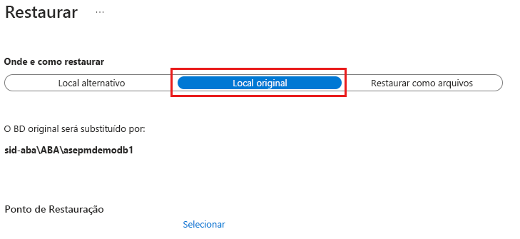 Para uma restauração in-loco, se o banco de dados estiver corrompido e você quiser restaurá-lo para o local original (origem), selecione Local original.