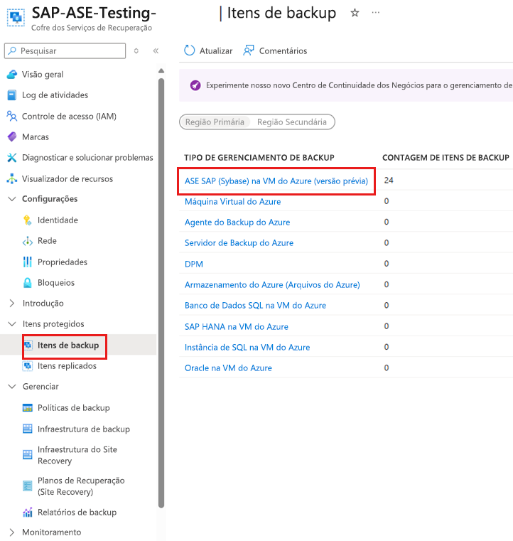 Vá para o cofre dos Serviços de Recuperação e, em seguida, selecione Itens de backup>SAP ASE (Sybase) na VM do Azure no tipo de gerenciamento de backup.