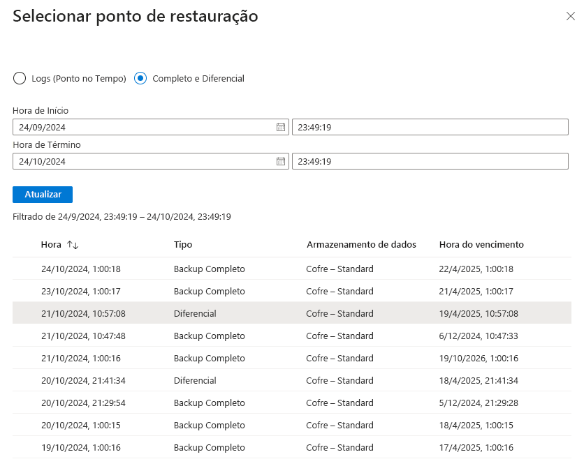 No painel Selecionar ponto de restauração , selecione Logs (Ponto no Tempo) para restaurar para um ponto específico no tempo. Ou selecione Full &Differential para restaurar para um ponto de recuperação específico.