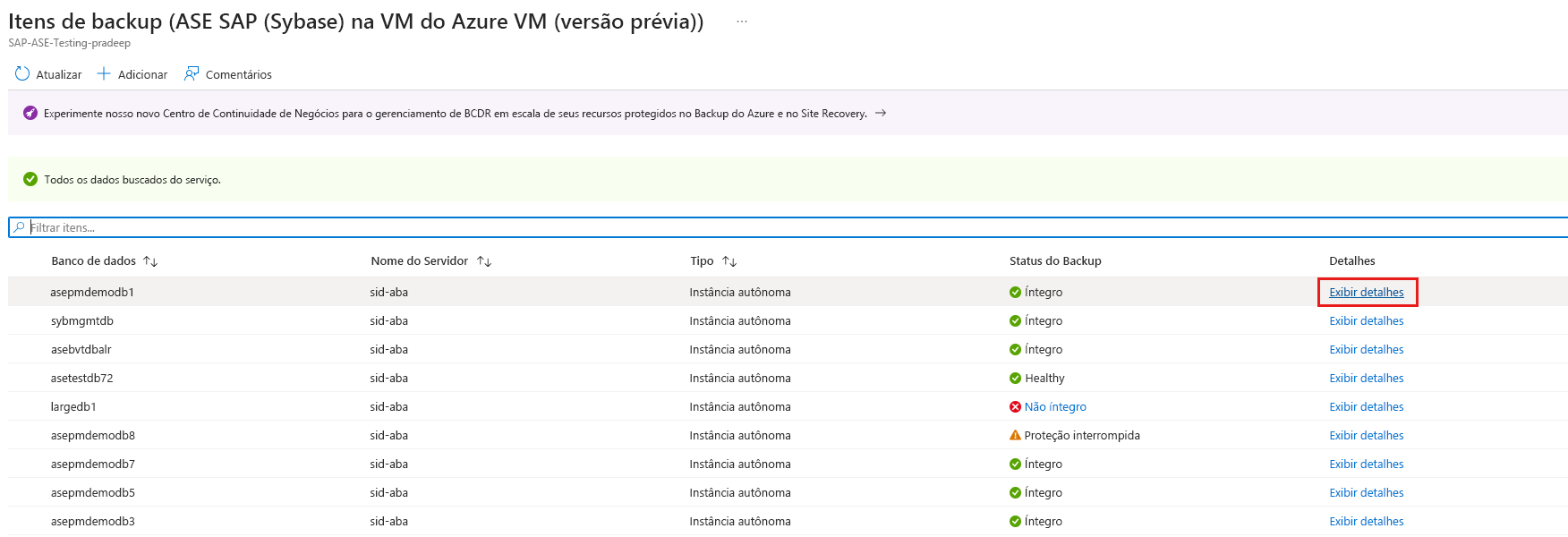 No painel Itens de Backup , selecione Exibir Detalhes do banco de dados para executar operações como Backup ou Restauração.