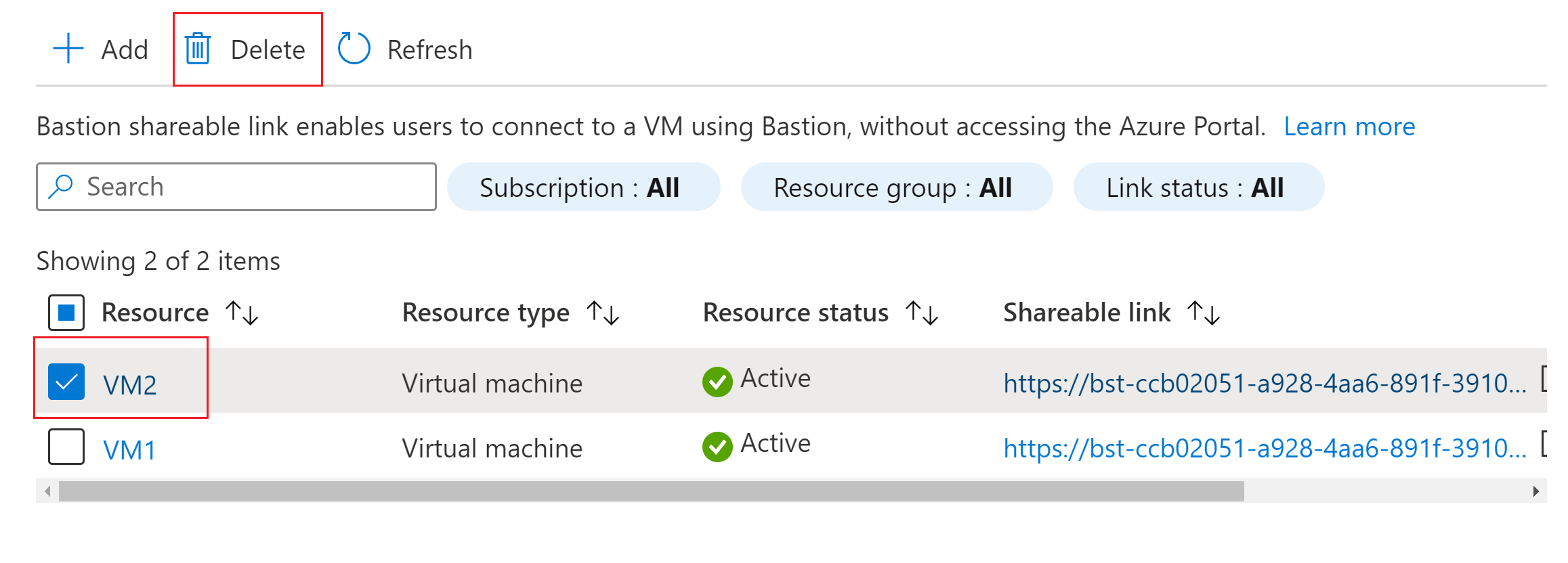 - Outro: exclui URLs compartilháveis para as VMs fornecidas em um bastion.