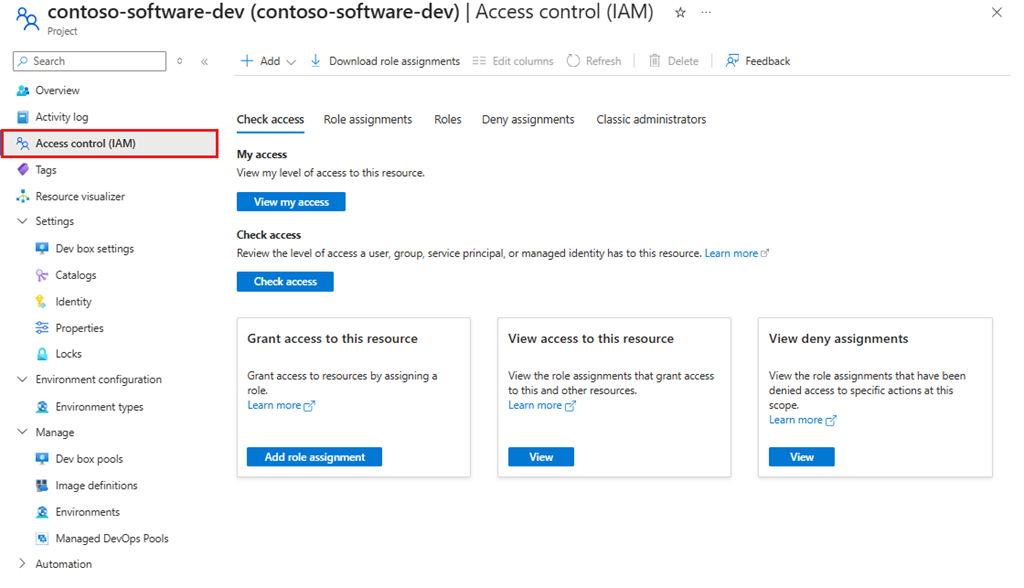 Para permitir que os usuários gerenciem projetos, atribua a eles a função DevCenter Project Admin. Siga as etapas em Provide access to a Dev Box Project, mas selecione a função DevCenter Project Admin em vez da função Dev Box User. Para obter mais informações, consulte Fornecer acesso a projetos para administradores de projeto.
