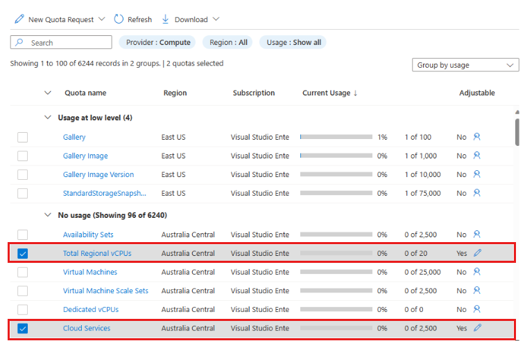 Estas etapas mostram como exibir as cotas atuais em sua assinatura para recursos específicos do Azure e ver qual porcentagem de cada cota usada.