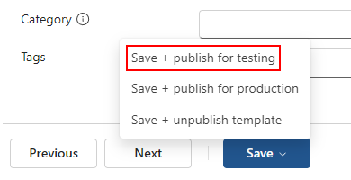 Na guia Resumo ou uma guia anterior, na parte inferior da guia, na lista Salvar , selecione Salvar + publicar para teste.