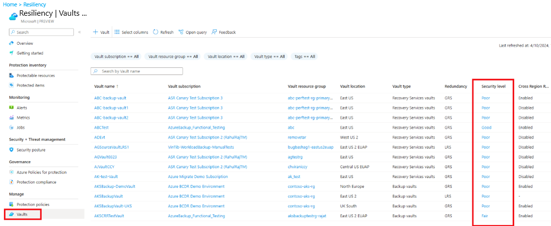 Os valores de nível de segurança são computados para o Backup do Azure somente em Resiliência.