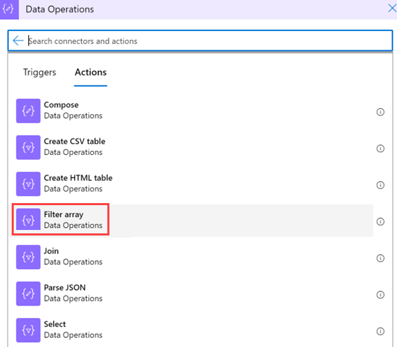 Em Escolher uma ação, na caixa de pesquisa, insira filtrar matriz como seu critério. Na lista de ações, selecione Operações de dados.