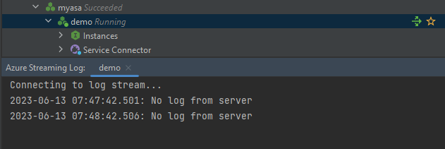 Abra a janela Azure Explorer, expanda o nó Azure, expanda o nó de serviço Aplicativos Spring do Azure, expanda a instância do Aplicativos Spring do Azure que você criou e selecione a instância de demonstração do aplicativo que você criou.
