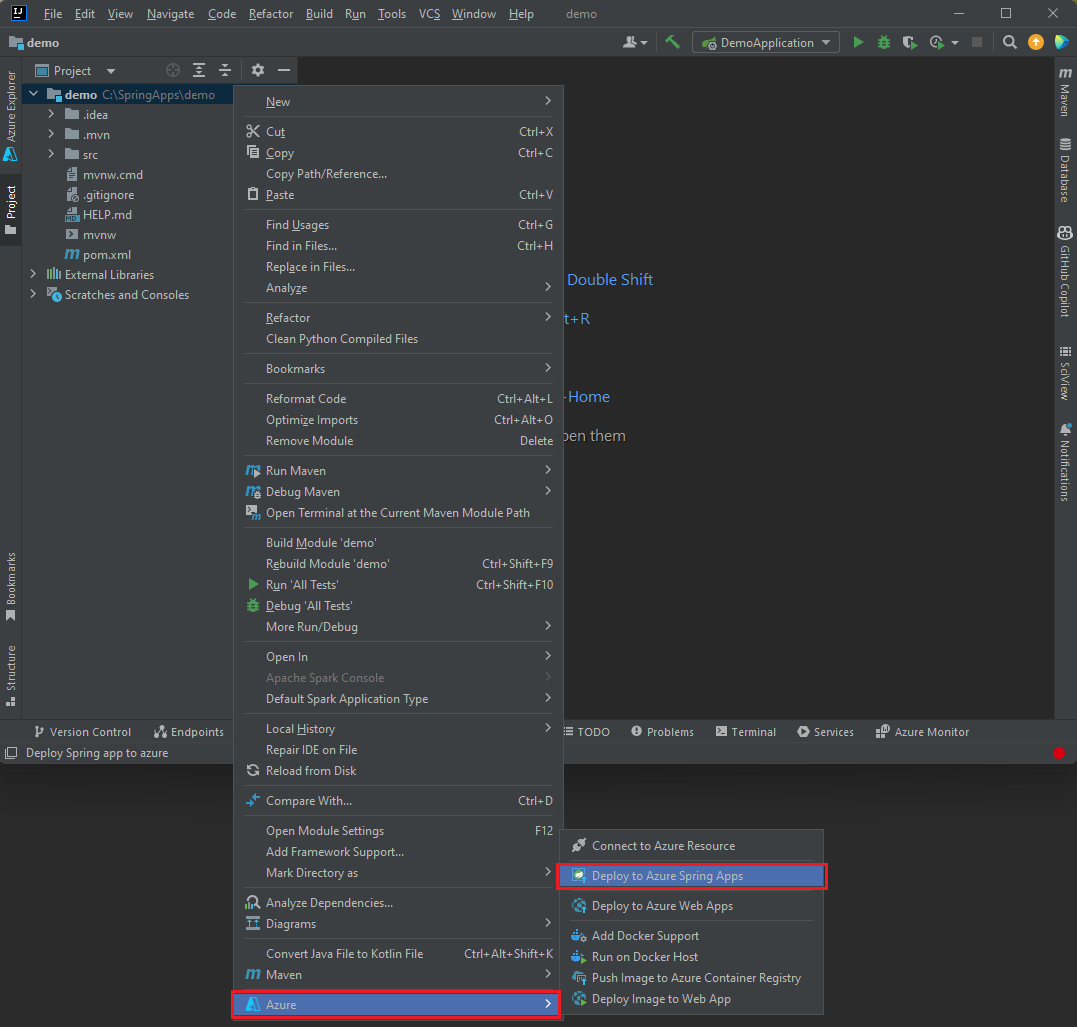 Clique com o botão direito do mouse em seu projeto na janela Projeto do IntelliJ e selecione Azure –>Implantar no Aplicativos Spring do Azure.