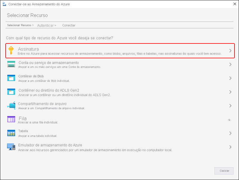 Na primeira inicialização, é exibido o diálogo Gerenciador de Armazenamento do Microsoft Azure – Conectar ao Armazenamento do Microsoft Azure. São exibidas várias opções de recursos aos quais você pode se conectar: