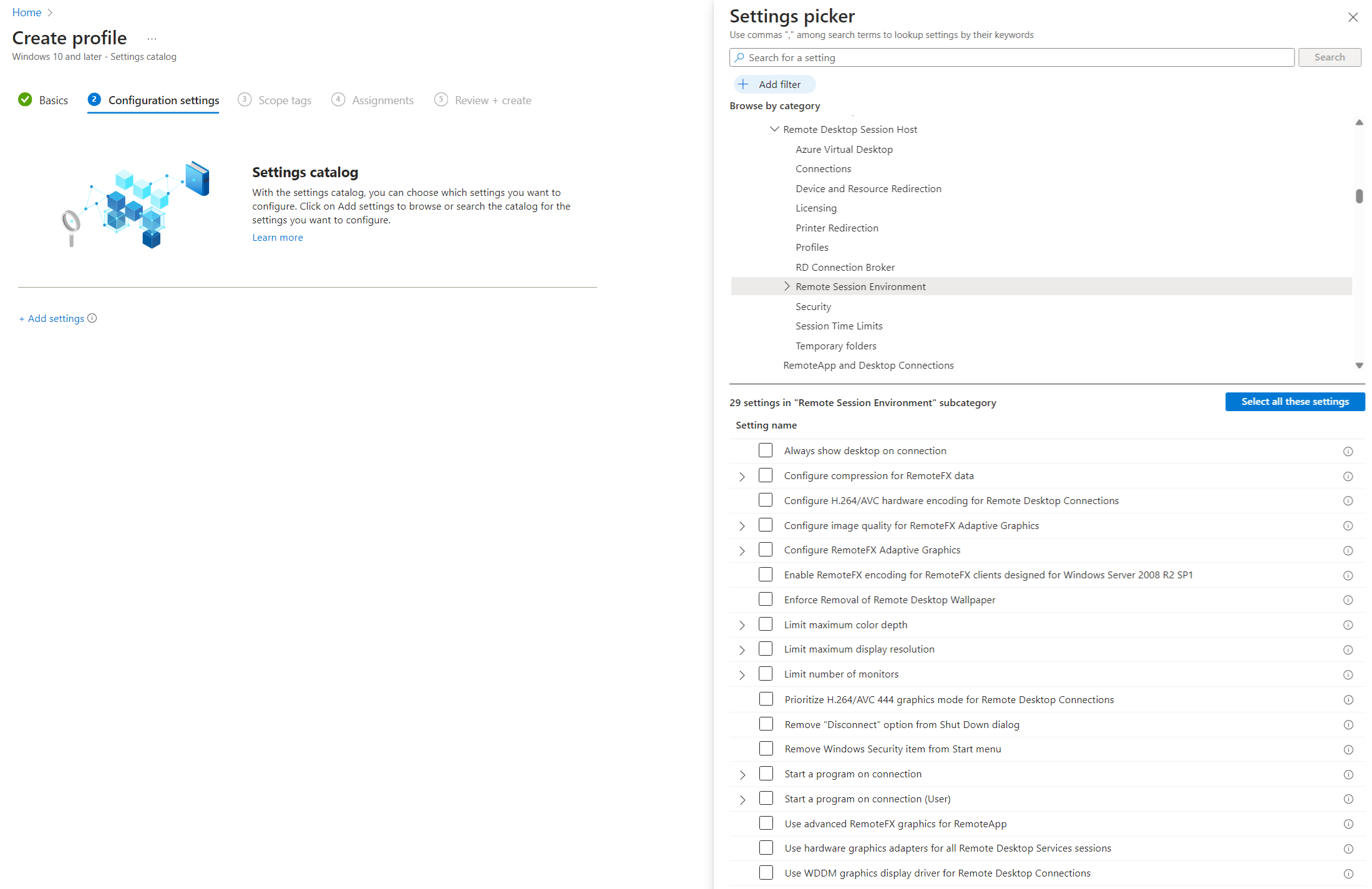Crie ou edite um perfil de configuração para dispositivos Windows 10 e posteriores, com o tipo de perfil de catálogo Definições.
