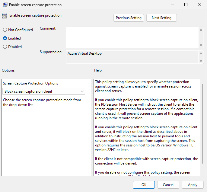 Dispositivos Windows e macOS: impede a captura de ecrã ao configurar anfitriões de sessão com uma política de configuração de dispositivos Intune ou Política de Grupo. Windows App ou o cliente de Ambiente de Trabalho Remoto impõe definições de proteção de captura de ecrã de um anfitrião de sessão sem configuração adicional.