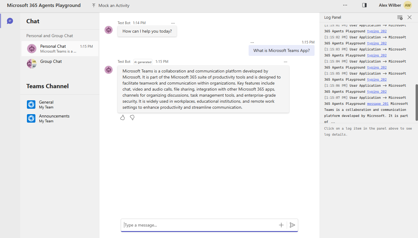 A capacidade de bot de uma aplicação do Teams cria um chatbot ou um bot de conversação. Pode utilizá-lo para executar tarefas simples e automatizadas, como fornecer suporte ao cliente. Um bot fala com um serviço Web e ajuda-o a utilizar as suas ofertas. Pode obter previsão meteorológica, fazer reservas ou qualquer outro serviço oferecido através de um bot de conversação.