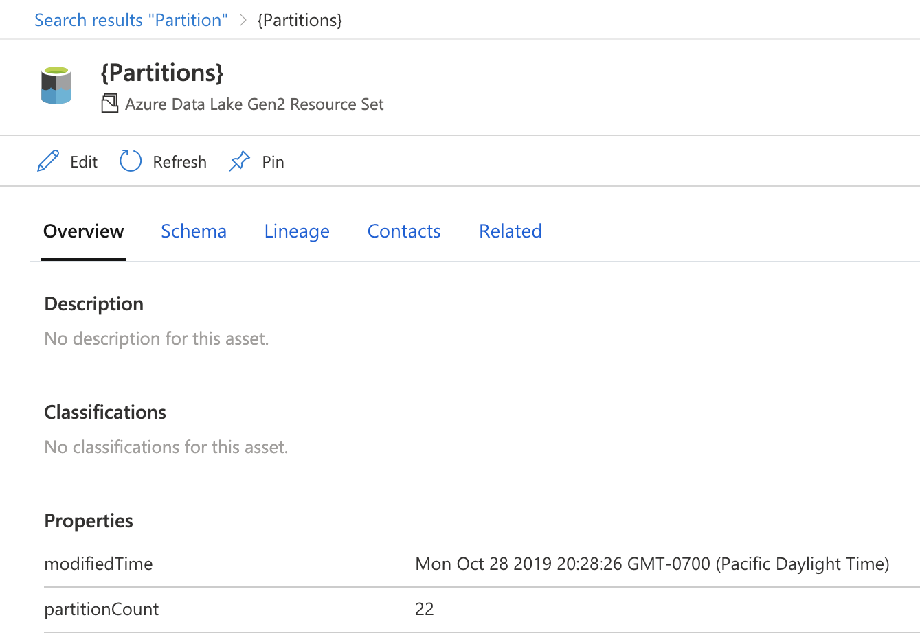 Procure ou procure Catálogo unificado do Microsoft Purview o ficheiro em que está interessado e navegue para a página de detalhes do recurso.