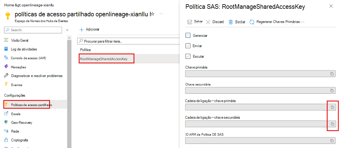 Em seguida, configure a instância Hubs de Eventos do Azure como o destino para o qual o OpenLineage envia os eventos.