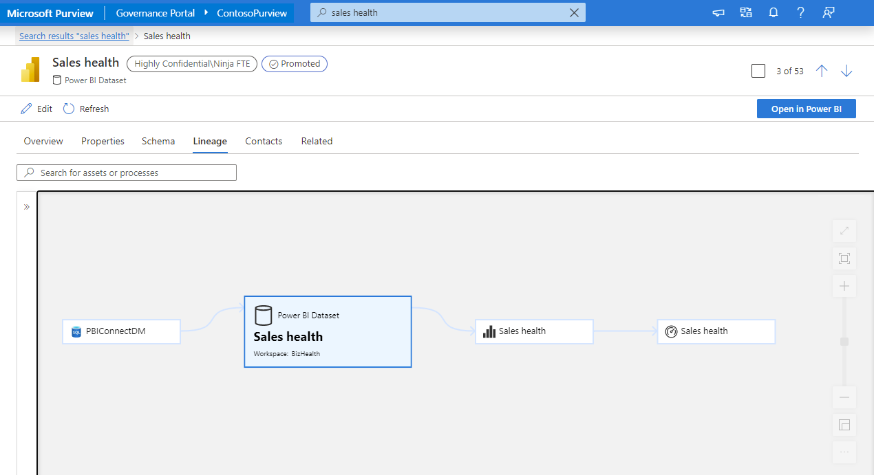 Os utilizadores podem procurar um artefacto do Power BI por nome, descrição ou outros detalhes para ver resultados relevantes. Nos separadores de propriedades e descrição geral do recurso, são apresentados os detalhes básicos, como a descrição, a classificação. No separador linhagem, as relações de recursos são apresentadas com as dependências upstream e a jusante.