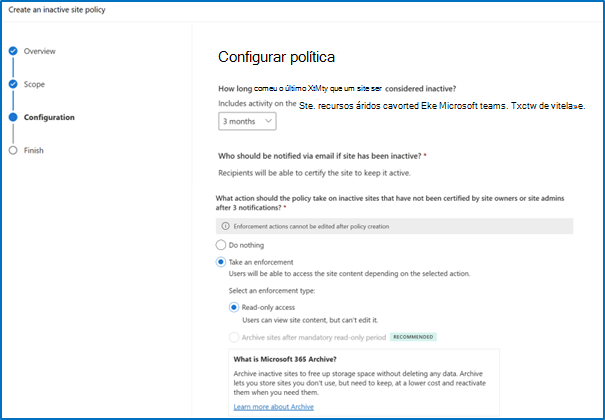 Ação de imposição Comportamento da política Não fazer nada Os proprietários do site ou os administradores do site recebem notificações mensais durante três meses. Após este período, não são enviadas notificações para os próximos três meses. Se o site permanecer pouco atraente após seis meses, as notificações mensais são retomadas. O relatório de execução de políticas lista sites não formatados como não acionados pelo proprietário do site. Pode transferir este relatório e filtrar sites marcados como não acionados. Acesso somente leitura Os proprietários do site ou os administradores do site recebem notificações mensais durante três meses. Se os destinatários da notificação não marcarem o site como atestado durante este período, o site entra no modo só de leitura. Arquivo sites após o período só de leitura obrigatório Os proprietários do site ou os administradores do site recebem notificações mensais durante três meses. Se os destinatários da notificação não marcarem o site como atestado durante este período, o site entrará no modo só de leitura durante uma duração configurável (3, 6, 9 ou 12 meses). Após o número de meses configurado, o site é arquivado através do Microsoft 365 Arquivo. O arquivo está sujeito ao inquilino que ativa o Microsoft 365 Arquivo no Centro de administração do Microsoft 365. A captura de ecrã seguinte mostra um exemplo de configuração de ações de imposição para uma política de atestado de site: