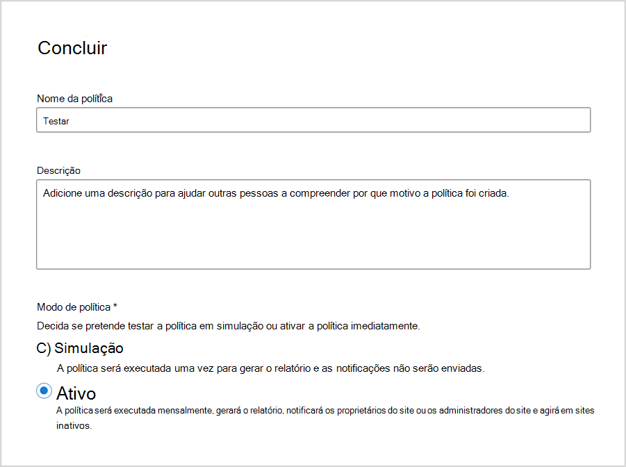 | Não fazer nada | Os destinatários especificados recebem notificações mensais durante três meses. Após este período, a política não envia notificações para os próximos três meses. Se o site permanecer inativo após seis meses, as notificações mensais são retomadas. O relatório de execução de políticas lista os sites inativos como não acionados pelo proprietário do site. Pode transferir este relatório e filtrar sites marcados como não acionados. |