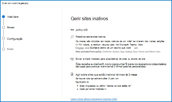 Selecione + Criar política. Reveja as informações gerir sites inativos e, em seguida, selecione Seguinte.