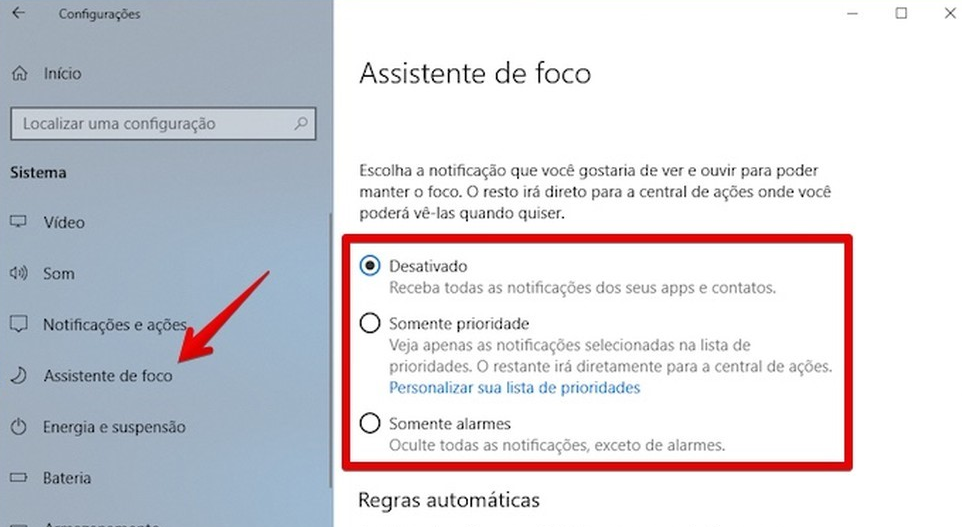 1. Clique no Menu Iniciar > Configurações> Sistema > Assistente de foco;