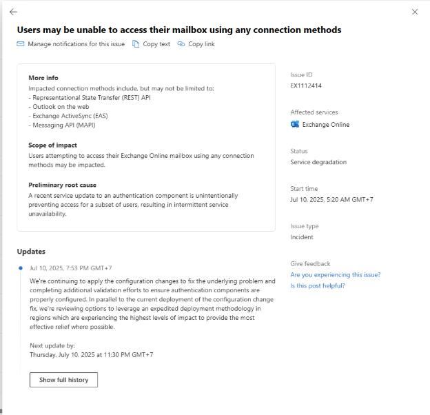 Nossa equipe de desenvolvedores está ciente desse problema e está trabalhando ativamente em uma resolução para lançar uma correção o mais rápido possível. Para obter mais detalhes, examine este relatório de incidente no menu Integridade do serviço no Centro de administração do Microsoft 365.