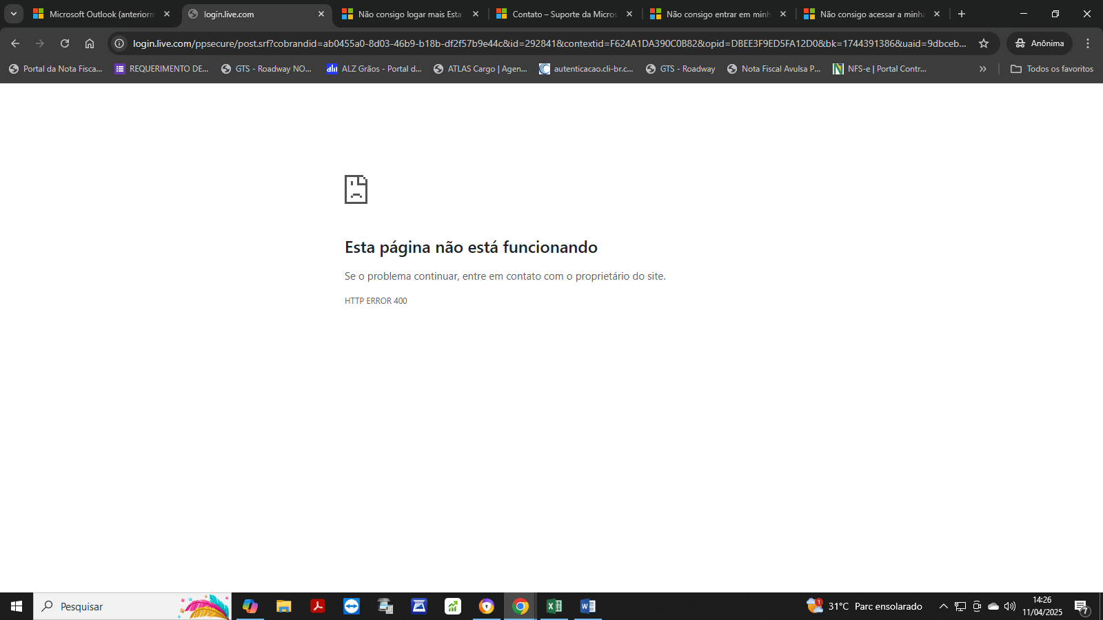Tentei entrar em minha conta no Outlook, porém aparece uma tela com a mensagem: "Ocorreu um problema. Não temos essa informação no momento. Tente novamente mais tarde."