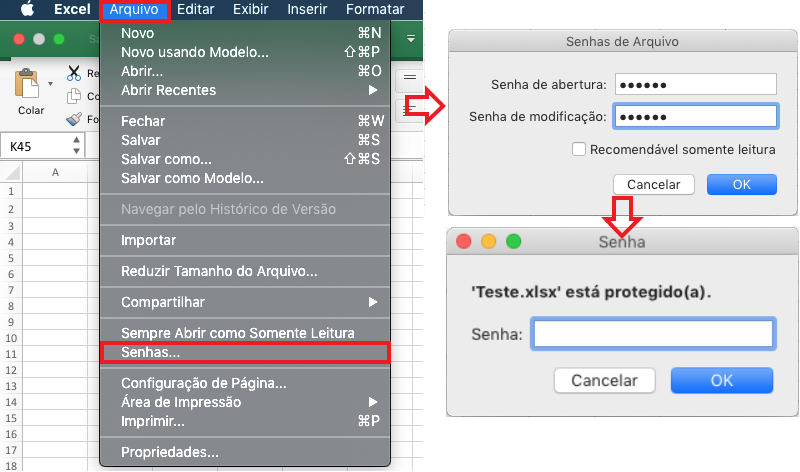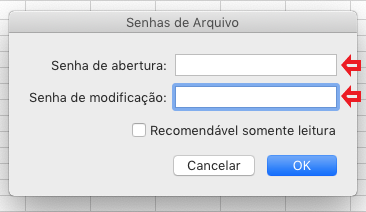 2. Defina a senha de abertura e modificação, ao iniciar o arquivo será solicitada as duas senhas;