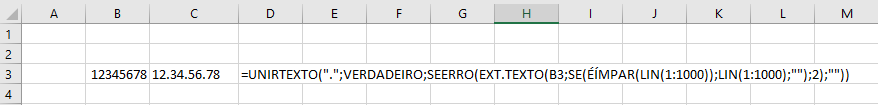 =UNIRTEXTO(".";VERDADEIRO;SEERRO(EXT.TEXTO(B3;SE(ÉIMPAR(LIN(1:1000));LIN(1:1000);"");2);""))