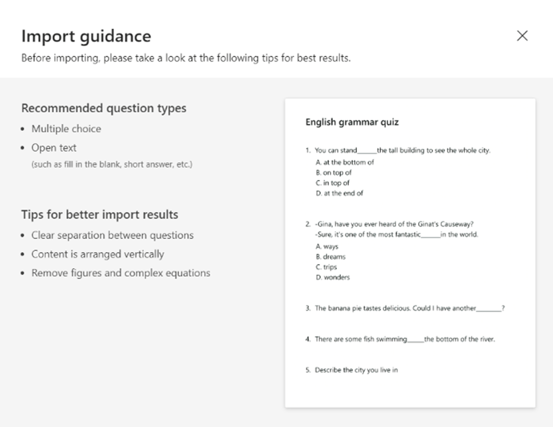 De acordo com sua descrição, parece que você deseja carregar um arquivo do Excel no Microsoft Forms e importar esses dados para o banco de dados do Microsoft Forms.