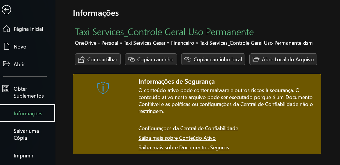 - Verifique se o arquivo está localizado em um local de rede. Se estiver, você poderá adicionar o local de rede à lista Locais Confiáveis na Central de Confiabilidade.