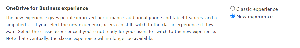 Nessa situação, gostaríamos de informá-lo de que as configurações da experiência Clássica na biblioteca de documentos do OneDrive for Business não parecem afetar a experiência do OneDrive, onde o padrão é o modo de exibição moderno. Portanto, gostaria de confirmar se a experiência do OneDrive for Business está definida como Nova Experiência:
