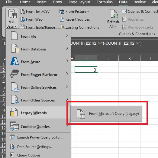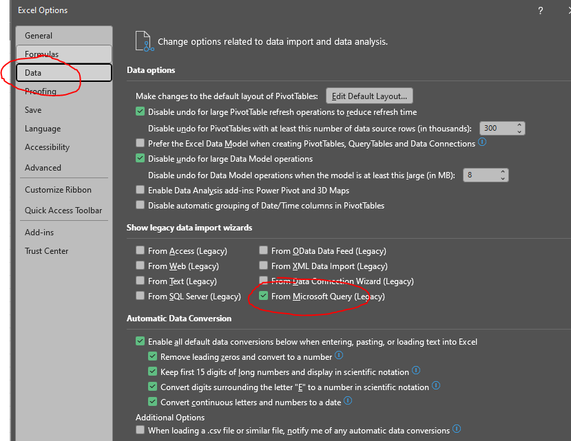 Arquivo>Opção>Dados>Verifique "Do Microsoft Query (Legado)"