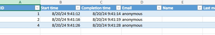 Excluímos a terceira resposta em nosso teste, e o ID do respondente permanece como está para a quarta resposta, conforme mostrado abaixo: