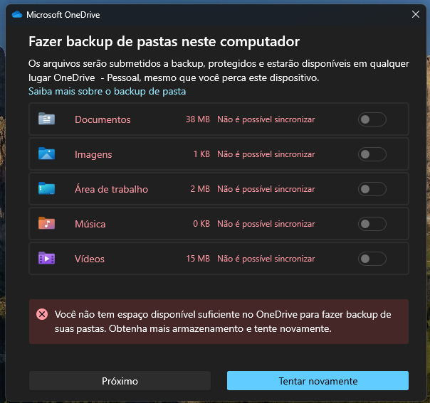 Com base na mensagem de erro apresentada, é possível que o OneDrive não esteja reconhecendo corretamente o armazenamento de 1 TB disponível em sua conta. Para tentar resolver, siga estas etapas iniciais: