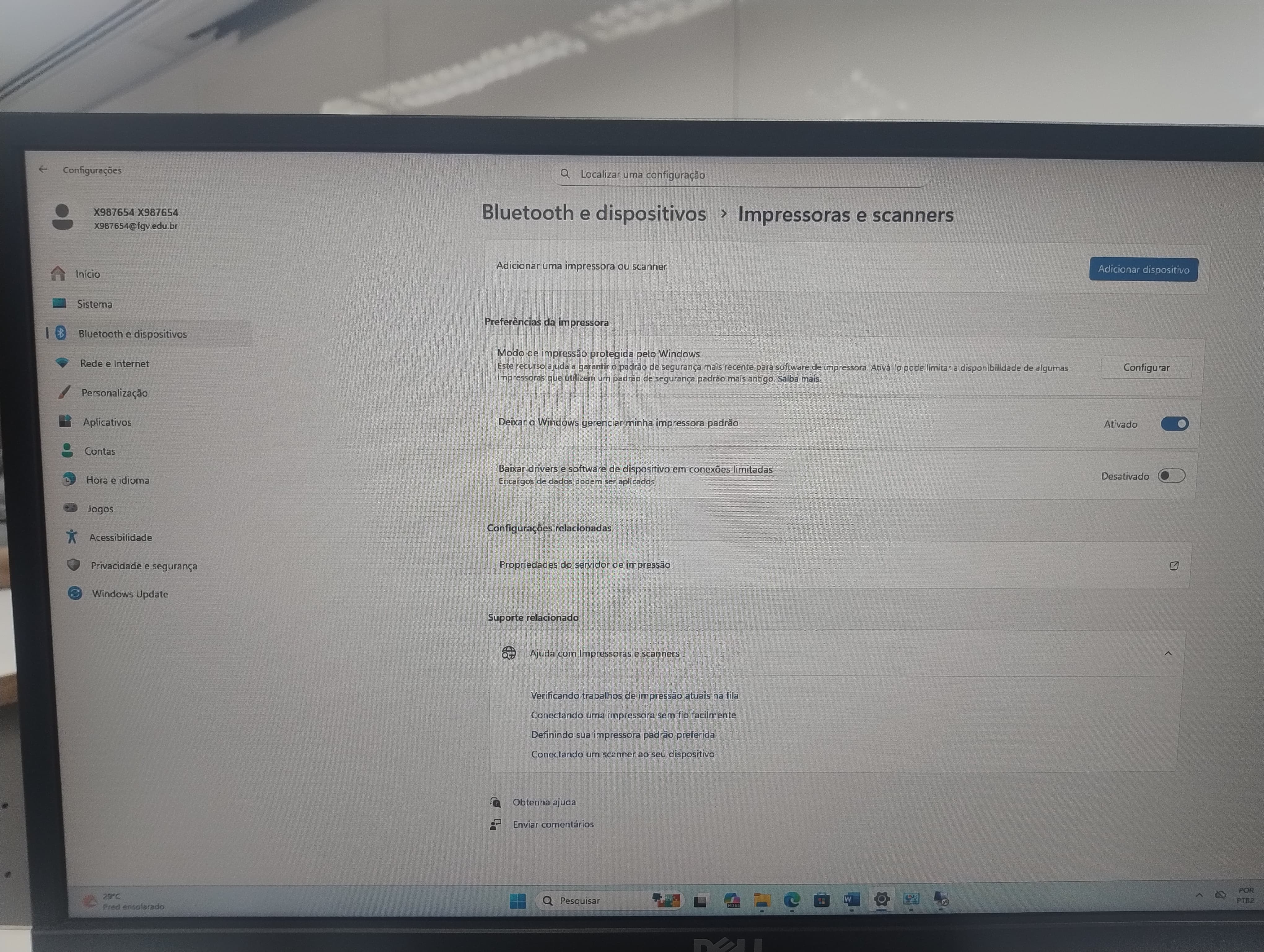 - Remover a impressora: Vá em Configurações > Bluetooth e dispositivos > Impressoras e scanners. Selecione a impressora com problema e clique em Remover dispositivo.