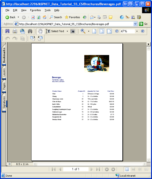 Com esta página criada, a imagem de uma determinada categoria pode ser visualizada visitando DisplayCategoryPicture.aspx?CategoryID=categoryID. A Figura 11 mostra a imagem da categoria Bebidas, que pode ser visualizada em DisplayCategoryPicture.aspx?CategoryID=1.
