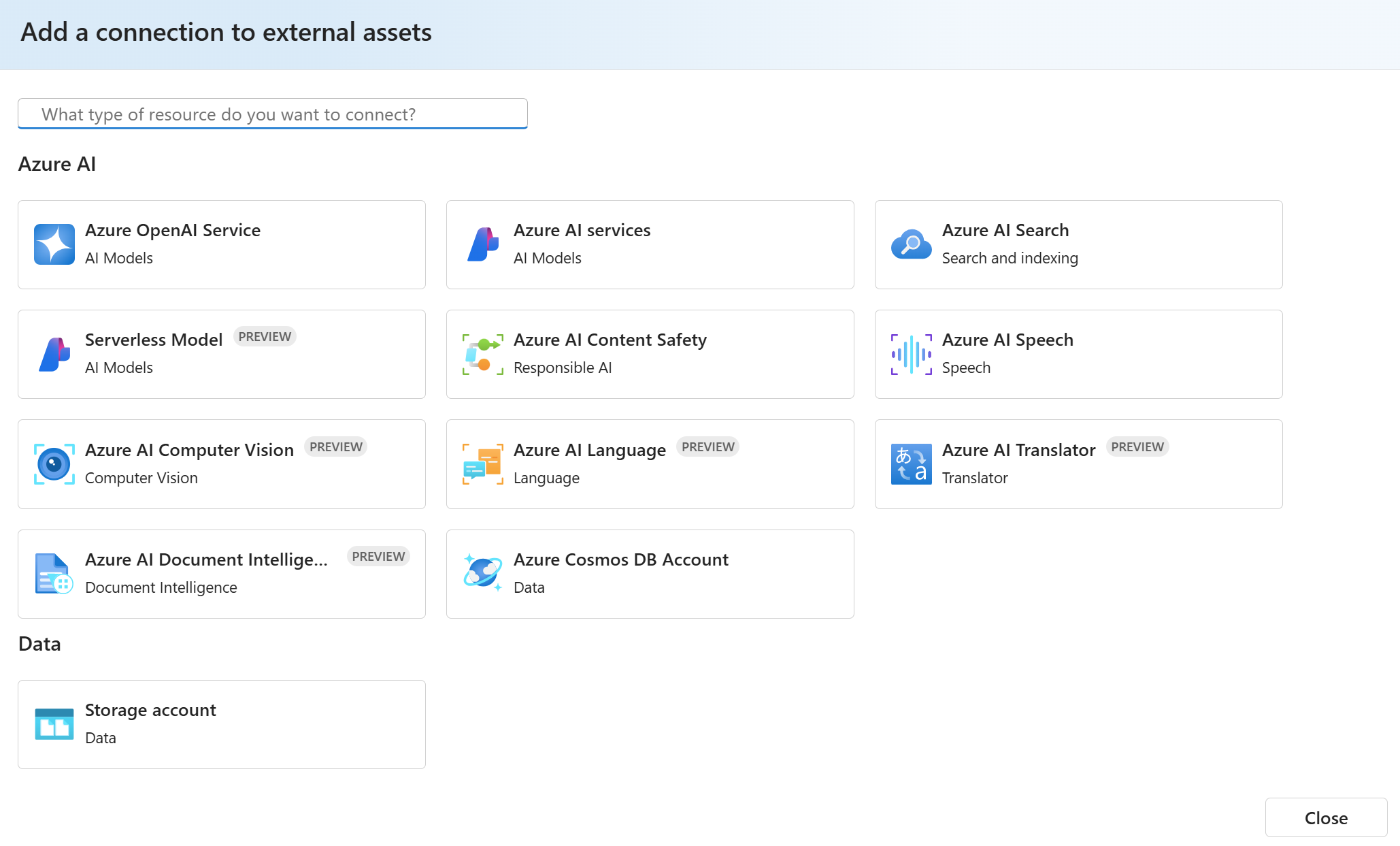 Na página Adicionar uma conexão a ativos externos , selecione o tipo de recurso que você deseja conectar ao projeto. Por exemplo, você pode selecionar Ferramentas de Foundry (para uma conexão com vários serviços em um recurso), Azure OpenAI em Modelos de Foundry, Segurança de Conteúdo do Azure, Fala do Azure, Linguagem do Azure e outras Ferramentas de Foundry.