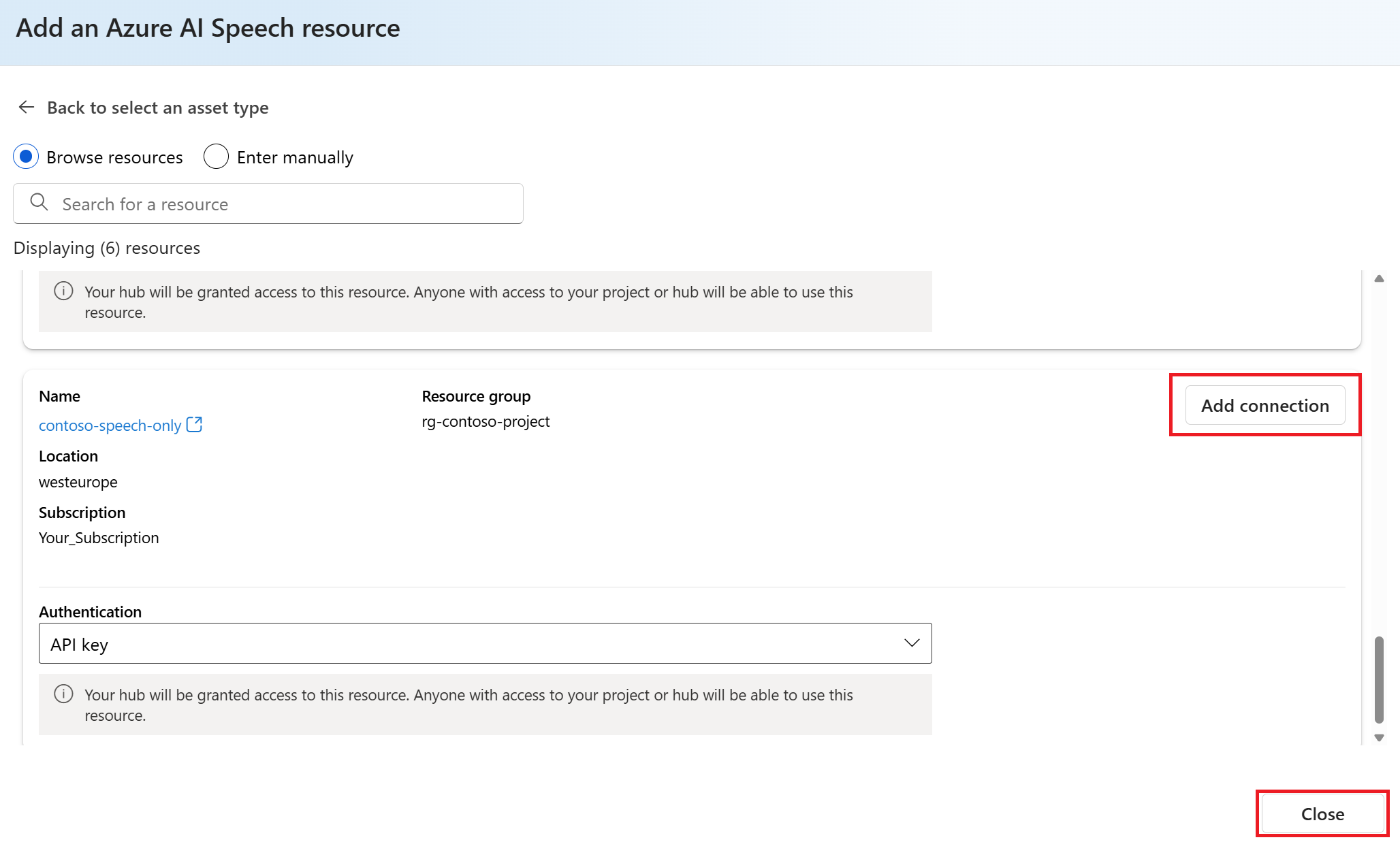 Na próxima página do assistente, navegue ou pesquise para localizar o recurso que você deseja conectar. Depois, selecione Adicionar conexão.