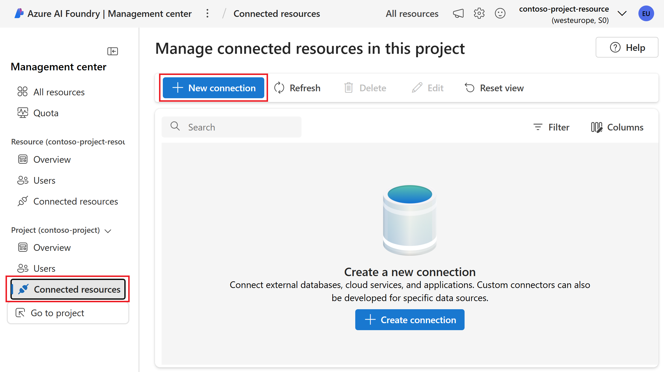 Você pode conectar recursos do Foundry Tools a um projeto do Foundry depois de criar um projeto. Para usar os recursos existentes das Ferramentas Foundry (como o Azure Speech nas Ferramentas do Foundry) em um projeto do Foundry, você precisa criar uma conexão com o recurso.