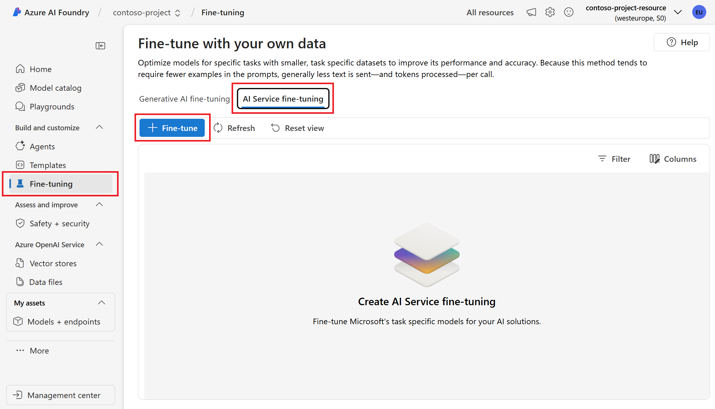 - Ajustar modelos. Você pode ajustar um subconjunto de modelos do Foundry Tools no portal Foundry.